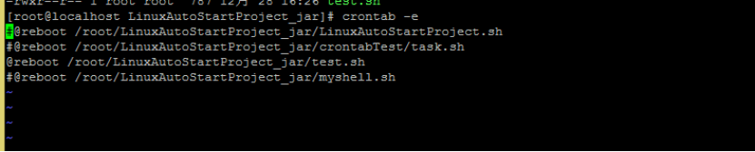 输入命令:@reboot /root/LinuxAutoStartProject_jar/test.sh
