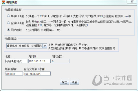 2、设置选项,映射类型选“网站映射”,映射线路根据你的情况选择,名称输入便于管理的名字即可,内网IP填映射目标的IP,本教程中内网web服务器的 IP是 192.168.2.15,内网端口不需要填写,网络通网站映射自动支持所有端口,域名前缀是自定义地址的前面部分,格式 域名前缀.3w.net579.com ,根据你的需求填写,如果你有自己的域名,还可以设置自定义域名我的世界端口映射,这里是。
