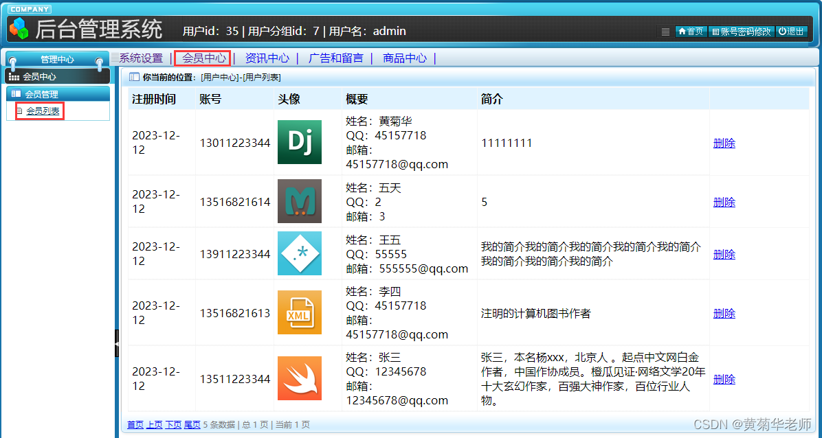 会员列表:查看所有注册会员信息,支持删除