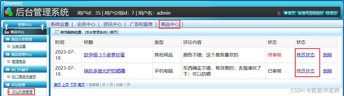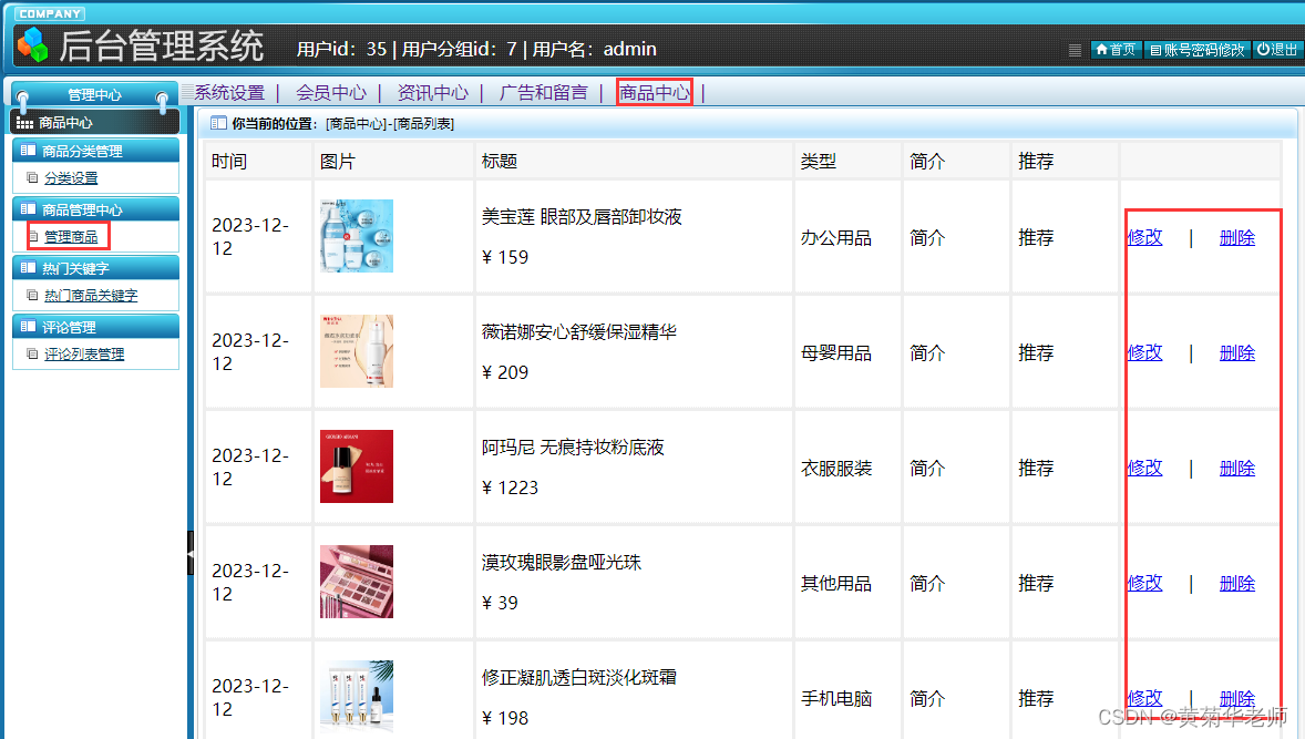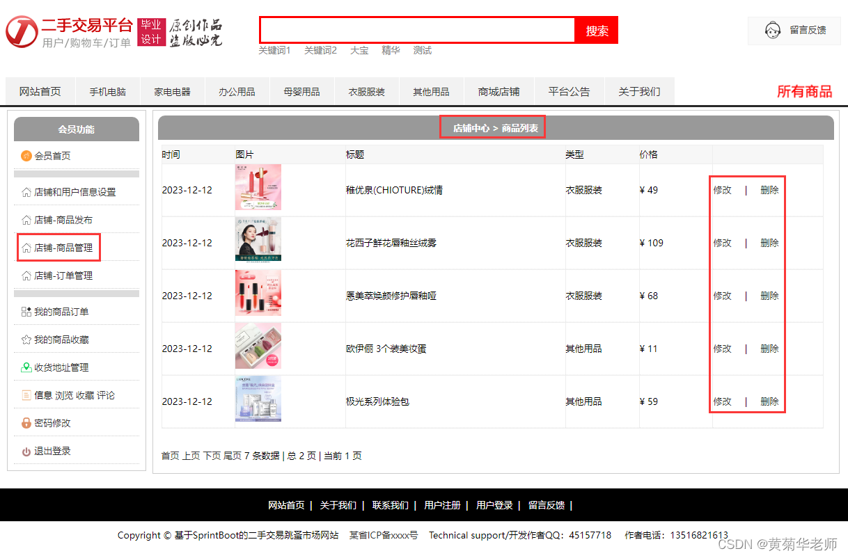 商品管理:显示店铺发布的所有商品,支持修改和删除