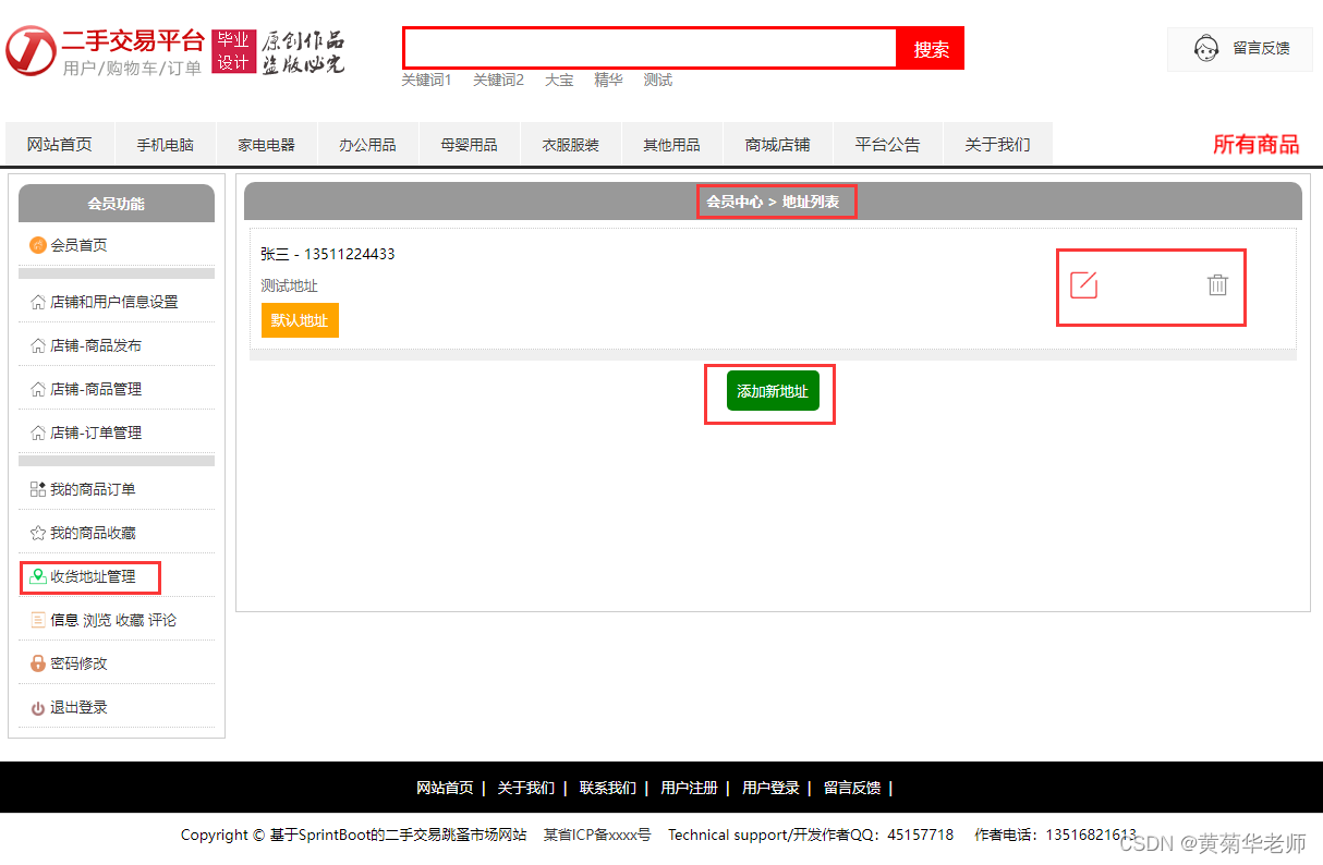收货地址管理:支持录入自己的地址,查看地址列表,支持修改和删除