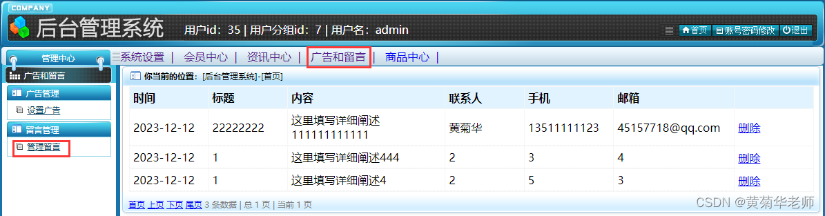 留言列表:所有用户留言信息列表,支持删除