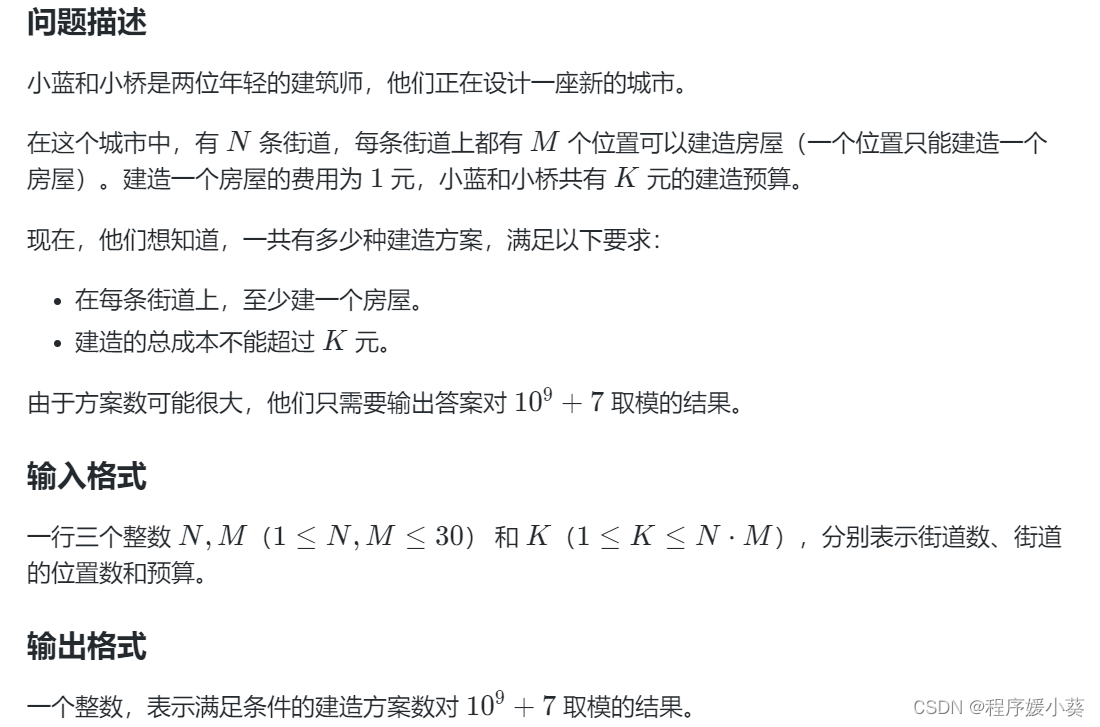 由于每条街道上至少需要建造一个房屋,因此我们可以将每条街道上的第一个房屋作为基准点。假设前i-1条街道中已经建造了j个房屋,那么对于第i条街道,我们可以考虑在不超过花费预算的情况下,分别建造1,2,···,m个房屋。这样,我们就可以得到状态转移方程: