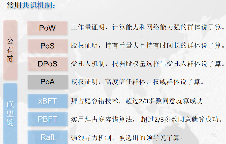 ◼通过共识,确保区块链上存储数据的一致性、完整性和安全性,防止数据分叉、双花攻击、数据丢失和重复记录等事件发生。