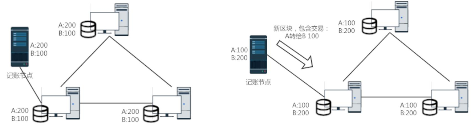 区块链技术又叫做分布式账本技术,每个全节点都拥有一套完整的区块链数据(也就是一套完整的账本或数据库),任何一方往区块链上的写入,都会同步到所有参与方的本地数据库中。