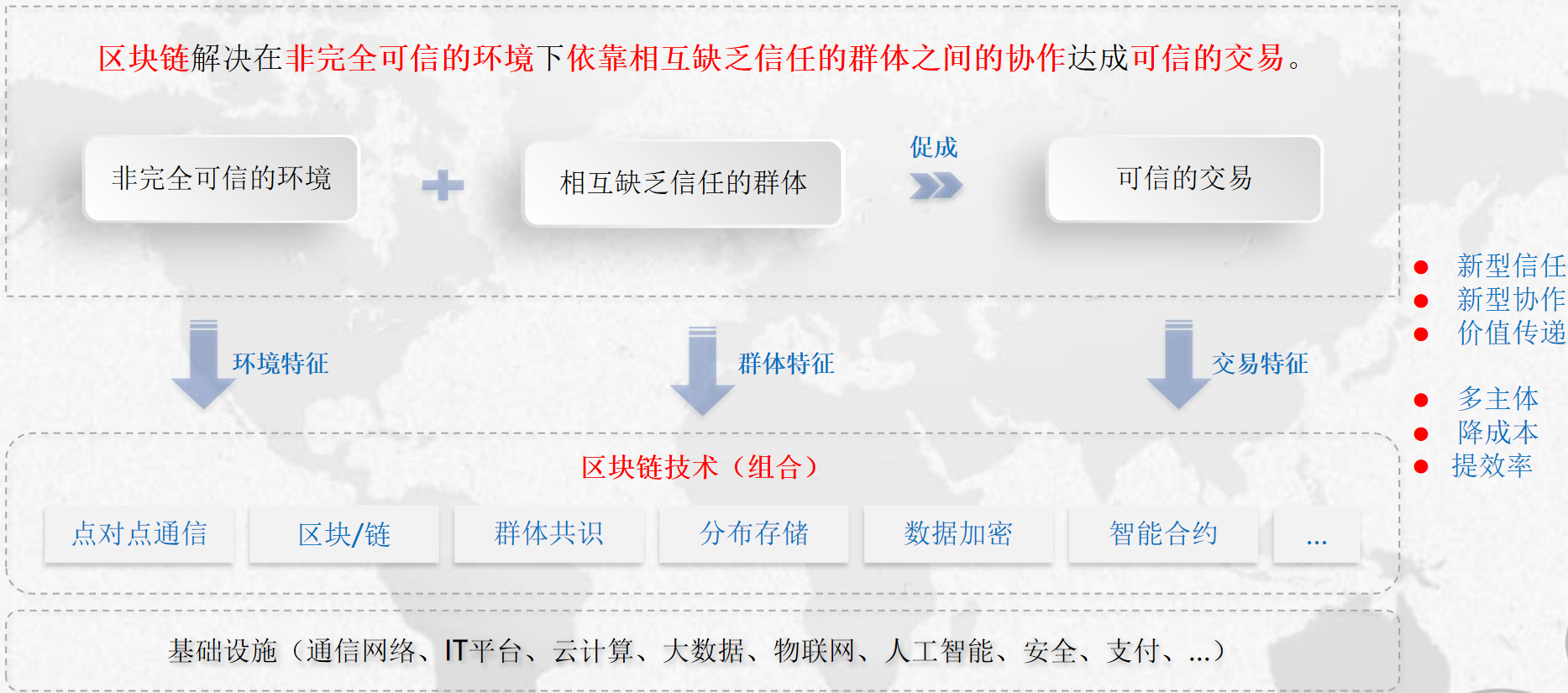 区块链来源于社会和经济发展需求,解决在非完全可信的环境下依靠相互缺乏信任的群体之间的协作达成可信的交易。