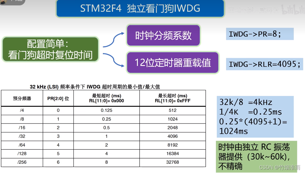 例如我们将分频系数的寄存器配置为8,将定时器重载值的寄存器配置为4095,rc振荡器的时钟位32kHZ,32kHZ八分频等于4kHZ,4kHZ的周期是0.25ms,然后0.25*(4095+1)=1024ms,1024ms就是看门狗的超时复位时间。我们要注意的是独立看门狗的时钟是由独立RC振荡器提供,它是不精确的