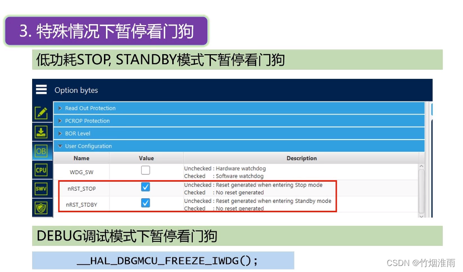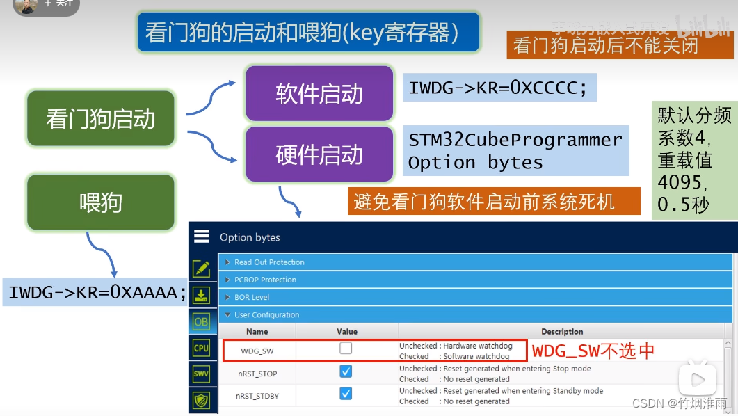 看门狗的启动和喂狗主要操作的是key寄存器。看门狗的启动可分为软件启动和硬件启动,其中软件启动更加常用,只需要将key寄存器设为0xCCCC,硬件启动可以通过STM32cube programmer来修改option bytes的选项即可,不选中WDG_SW就可以是单片机上电后自动硬件启动看门狗。