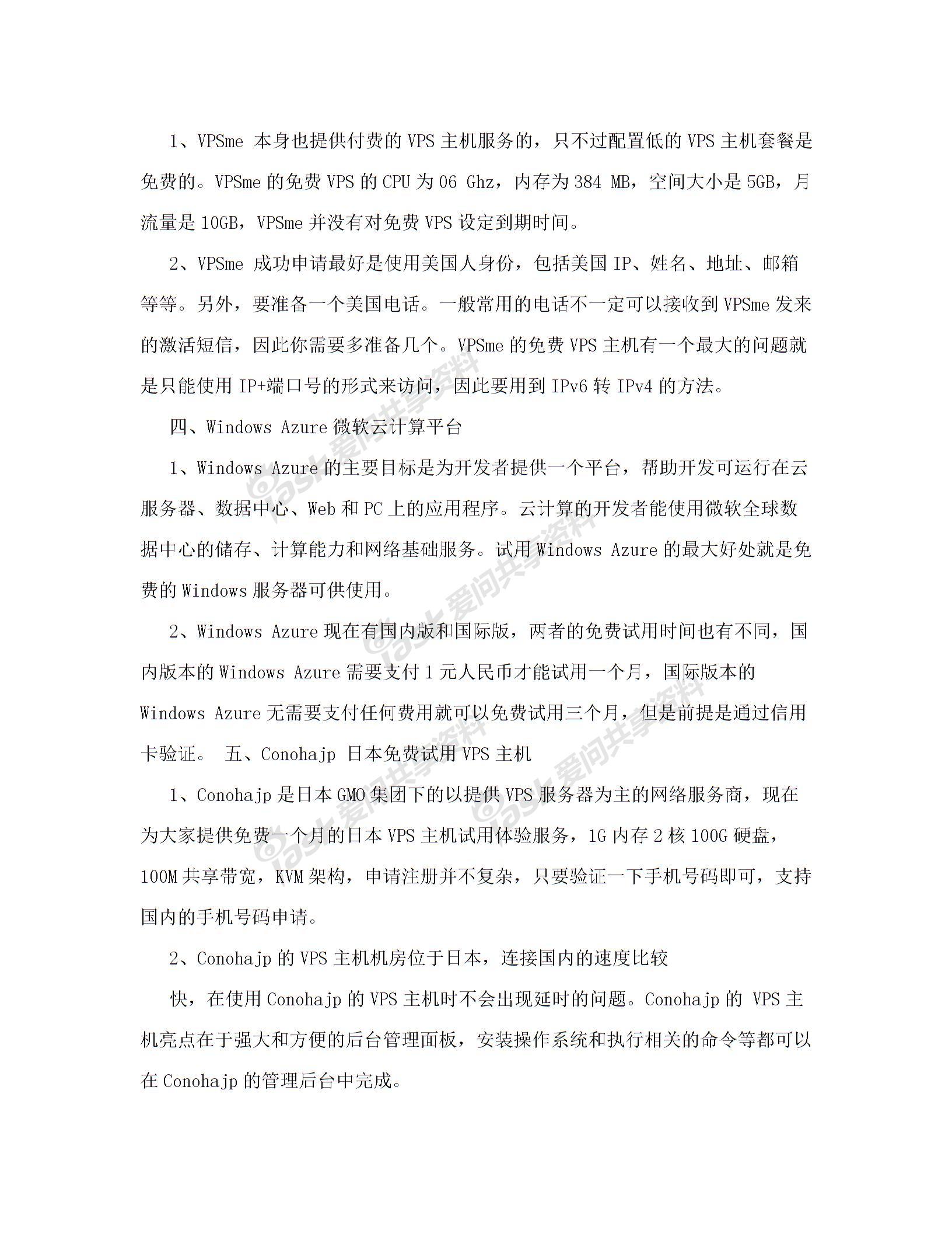 没人使用而被取消账号三VPSme专业的免费VPS主机服务1VPSme本身也提供付费的VPS主机服务的只不过配置低的VPS主机套餐是免费的VPSme的免费VPS的CPU为06Ghz内存为384MB空间大小是5GB月流量是10GBVPSme并没有对免费VPS设定到期时间2VPSme成功申请最好是使用美国人身份包括美国IP姓名地址邮箱等等另外要准备一个美国电话一般常用的电话不一定可以接收到VPSme发来的激活短信因此你需要多准备几个VPSme的免费VPS主机有一个最大的问题就是只能使用IP端口号的形式来访问因此要用到IPv6转IPv4的方法四WindowsAzure微软云计算平台1WindowsAzure的主要目标是为开发者提供一个平台帮助开发可运行在云服务器数据中心Web和PC上的应用程序云计算的开发者能使用微软全球数据中心的储存计算能力和网络基础服务试用WindowsAzure的最大好处就是免费的Windows服务器可供使用2WindowsAzure现在有国内版和国际版两者的免费试用时间也有不同国内版本的WindowsAzure需要支付1元人民币才能试用一个月国际版本的WindowsAzure无需要支付任何费用就可以免费试用三个月但是前提是通过信用卡验证五Conohajp日本免费试用VPS主机1Conohajp是日本GMO集团下的以提供VPS服务器为主的网络服务商现在为大家提供免费一个月的日本VPS主机试用体验服务1G内存2核100G硬盘100M共享带宽KVM架构申请注册并不复杂只