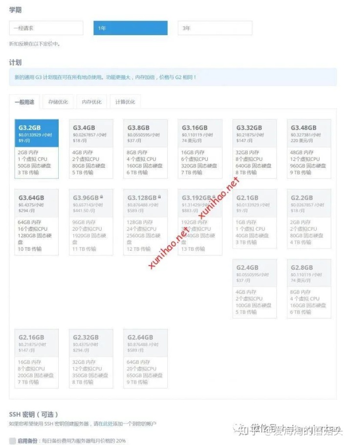 免费的实例计划只能选择 G3.2GB 或 G2.1GB 选项,其它选项都是要收费的。所以千万不要选错了。而3.2GB是2GB内存,如果不是特殊情况,建议选择G3.2GB计划。