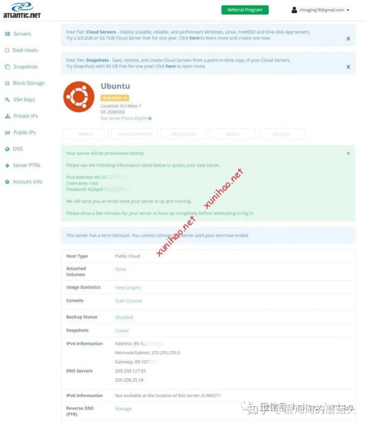 创建成功之后,主界面会有当前免费VPS实例的root密码、固定IP、DNS等信息