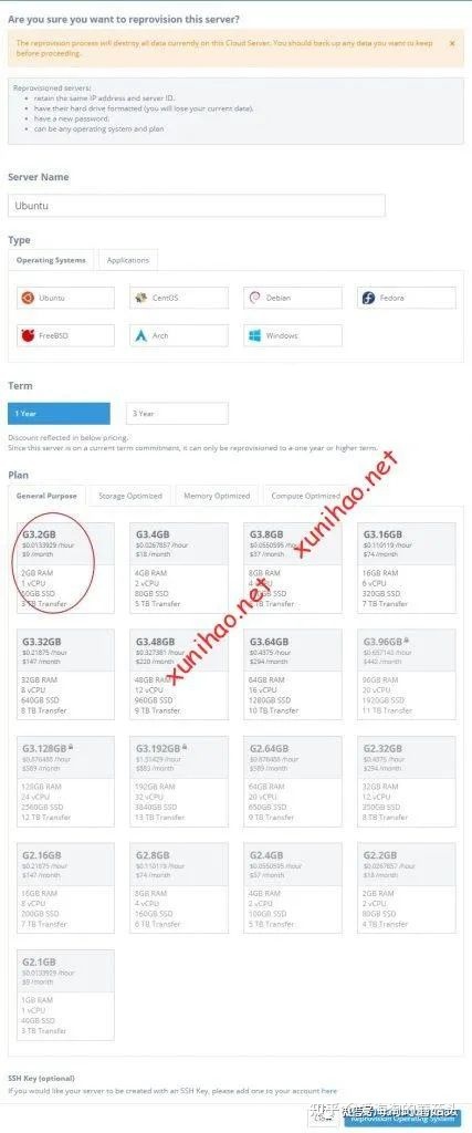 点击Reprovision重装后,再输入服务器的名称,选择操作系统和版本。和创建免费实例的选项一样,只能选1年和G3.2GB选项