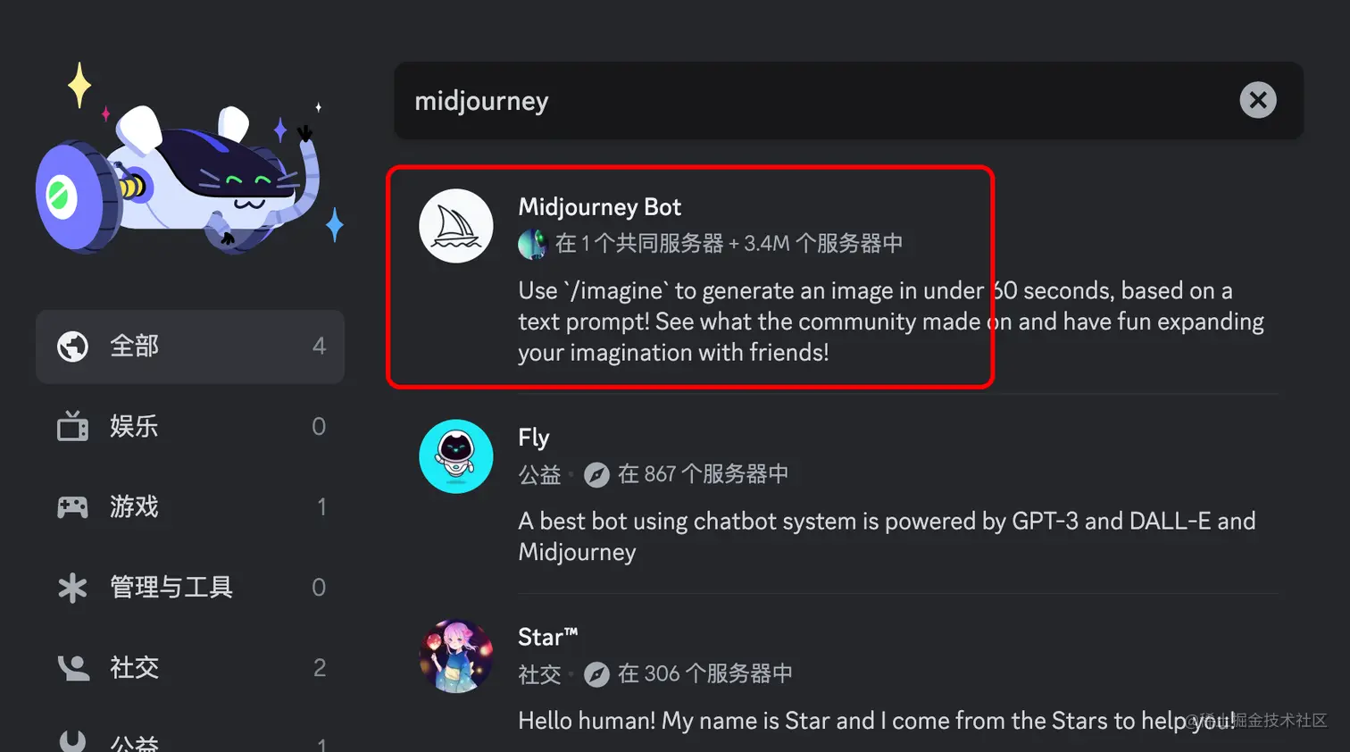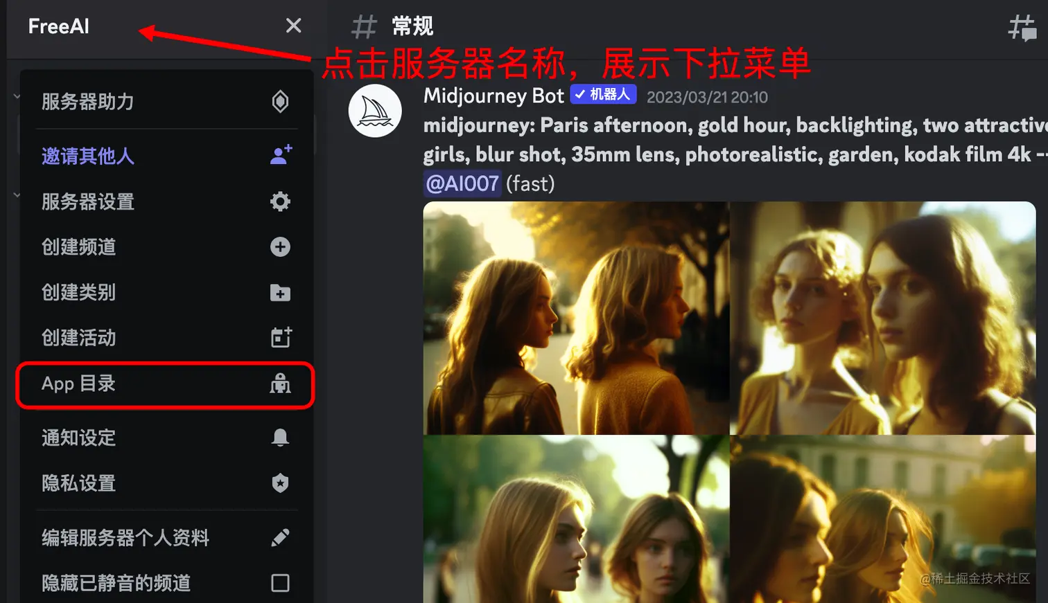 2. 添加 midjourney 机器人,按下图选择App目录,在弹窗中搜索midjourney,将midjourney bot添加至服务器