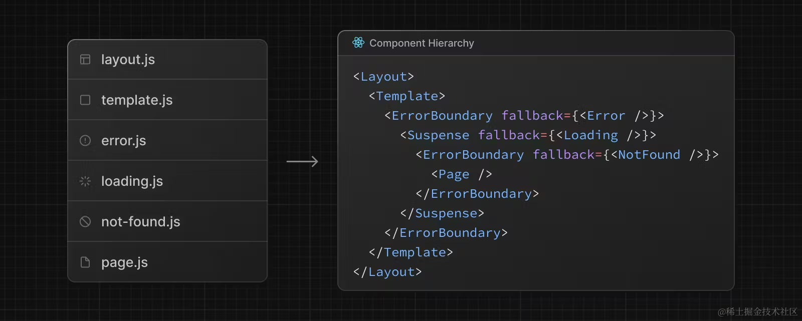 从这张图里你会发现一个问题,因为 Layout 和 Template 在 ErrorBoundary 外面,这说明错误边界不能捕获同级的 layout.js 或者 template.js 中的错误。如果你想捕获特定布局或者模板中的错误,那就在父级的 error.js 里进行捕获。