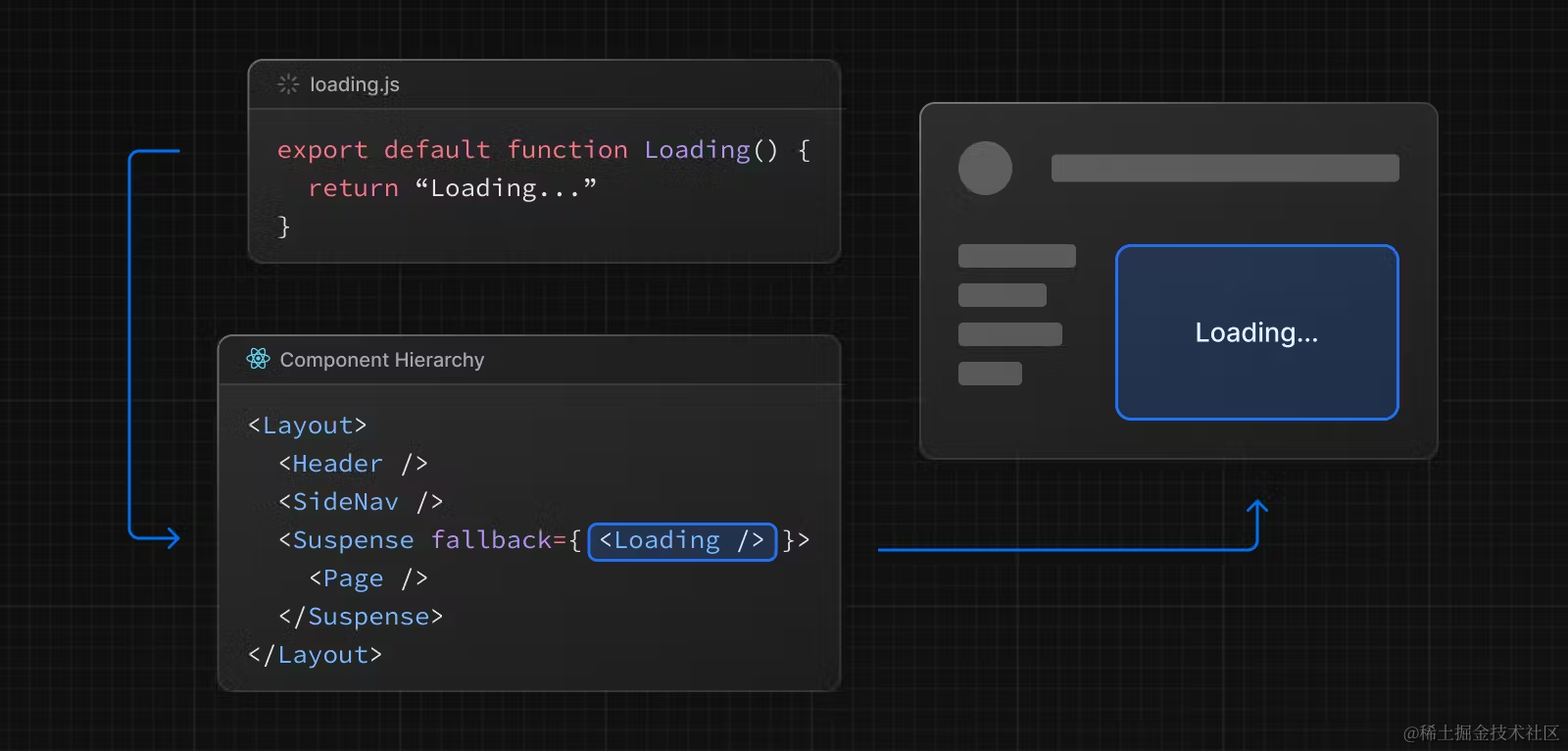 loading.js 的实现原理是将 page.js和下面的 children 用 包裹。因为page.js导出一个 async 函数,Suspense 得以捕获数据加载的 promise,借此实现了 loading 组件的关闭。