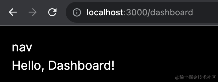 其中,nav 来自于 app/dashboard/layout.js,Hello, Dashboard! 来自于 app/dashboard/page.js