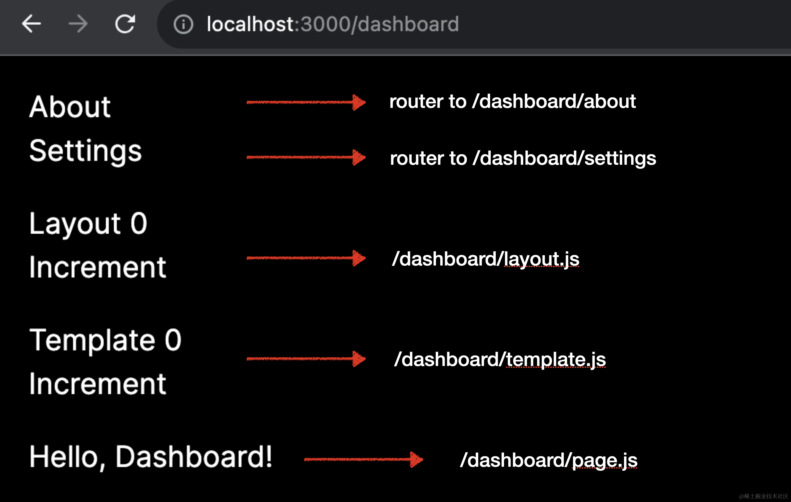 app └─ dashboard ├─ layout.js ├─ page.js ├─ template.js ├─ about │ └─ page.js └─ settings └─ page.js