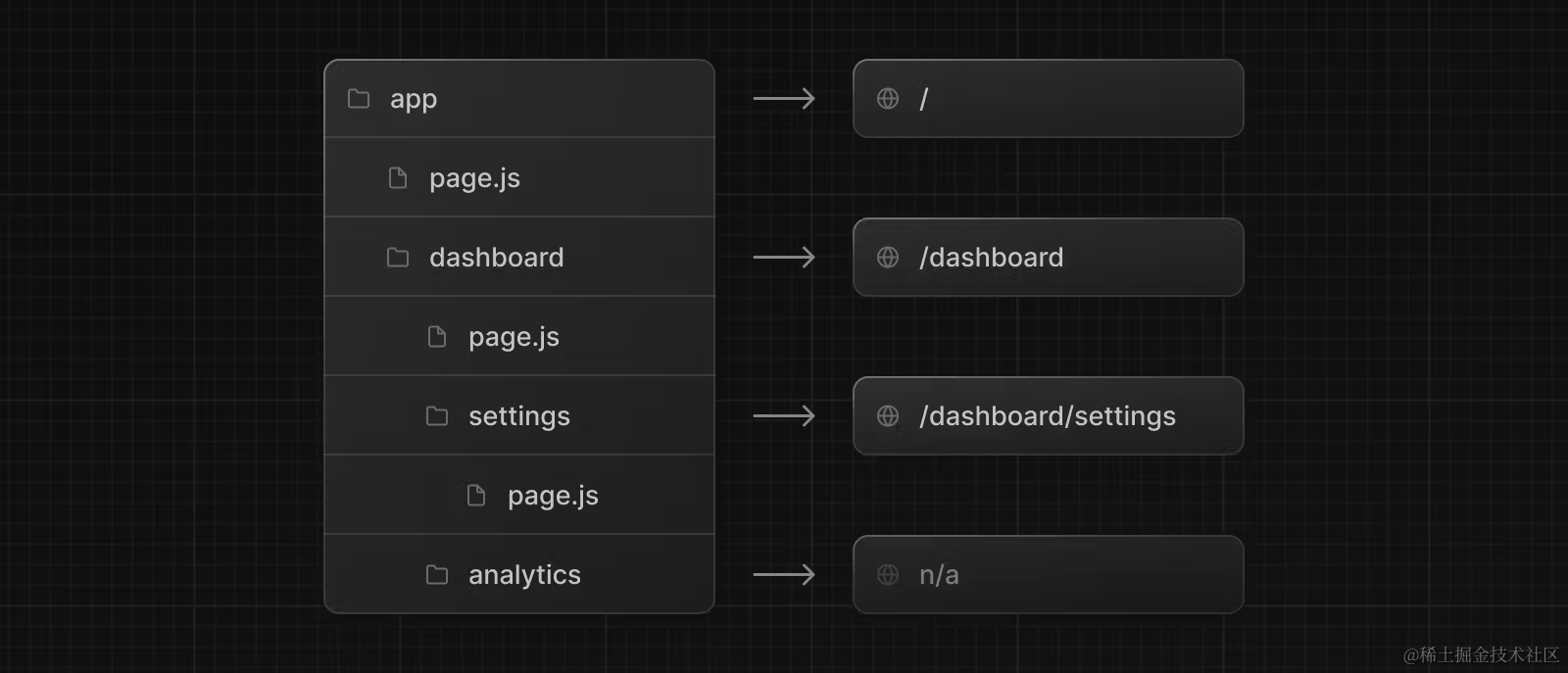 - analytics 目录下因为没有 page.js 文件,所以没有对应的路由。这个文件可以被用于存放组件、样式表、图片或者其他文件。