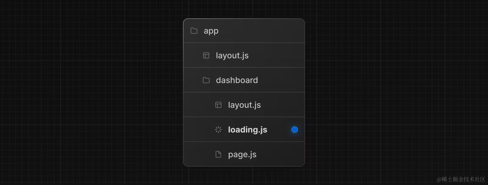 了解了原理,那我们来看看如何写这个 loading.js吧。dashboard 目录下我们新建一个 loading.js。