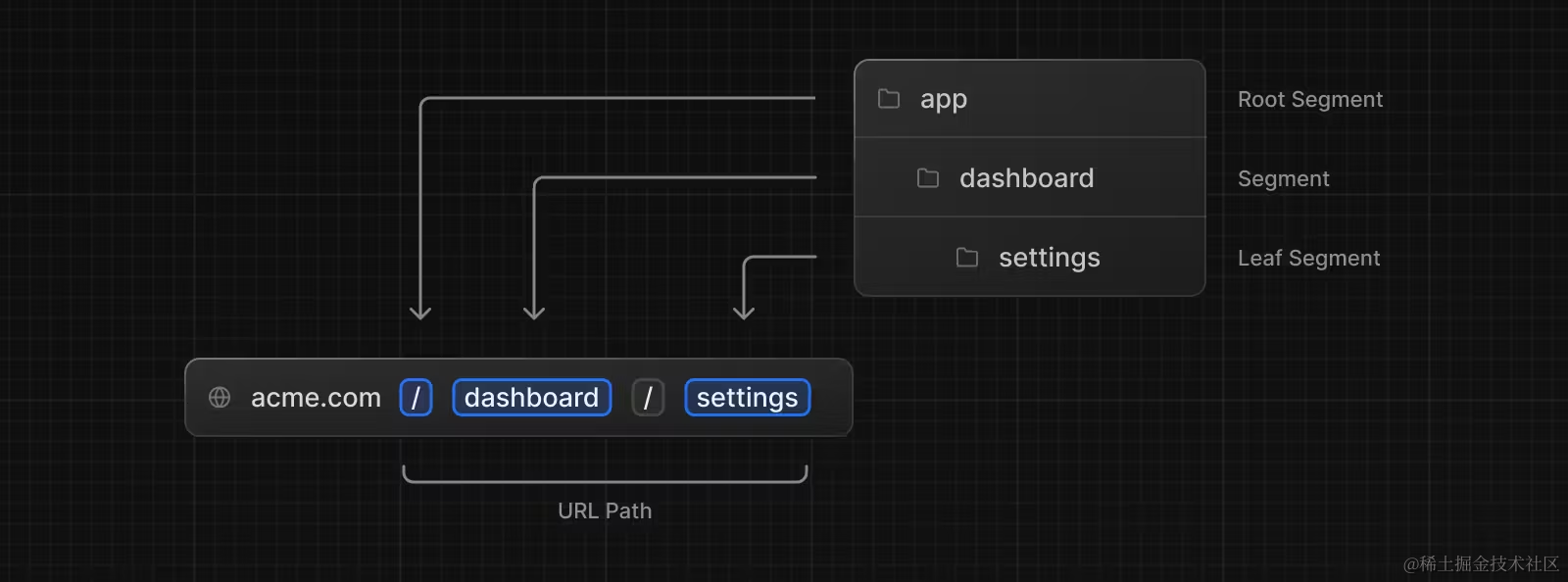 首先是定义路由,文件夹被用来定义路由。每个文件夹都代表一个对应到 URL 片段的路由片段。创建嵌套的路由,只需要创建嵌套的文件夹。举个例子,下图的 app/dashboard/settings目录对应的路由地址就是 /dashboard/settings:
