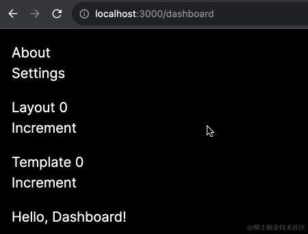 现在点击两个 Increment 按钮,会开始计数。随便点击下数字,然后再点击 About或者 Settings切换路由,你会发现,Layout 后的数字没有发生变化,Template 后的数字重置为 0。这就是所谓的状态保持。