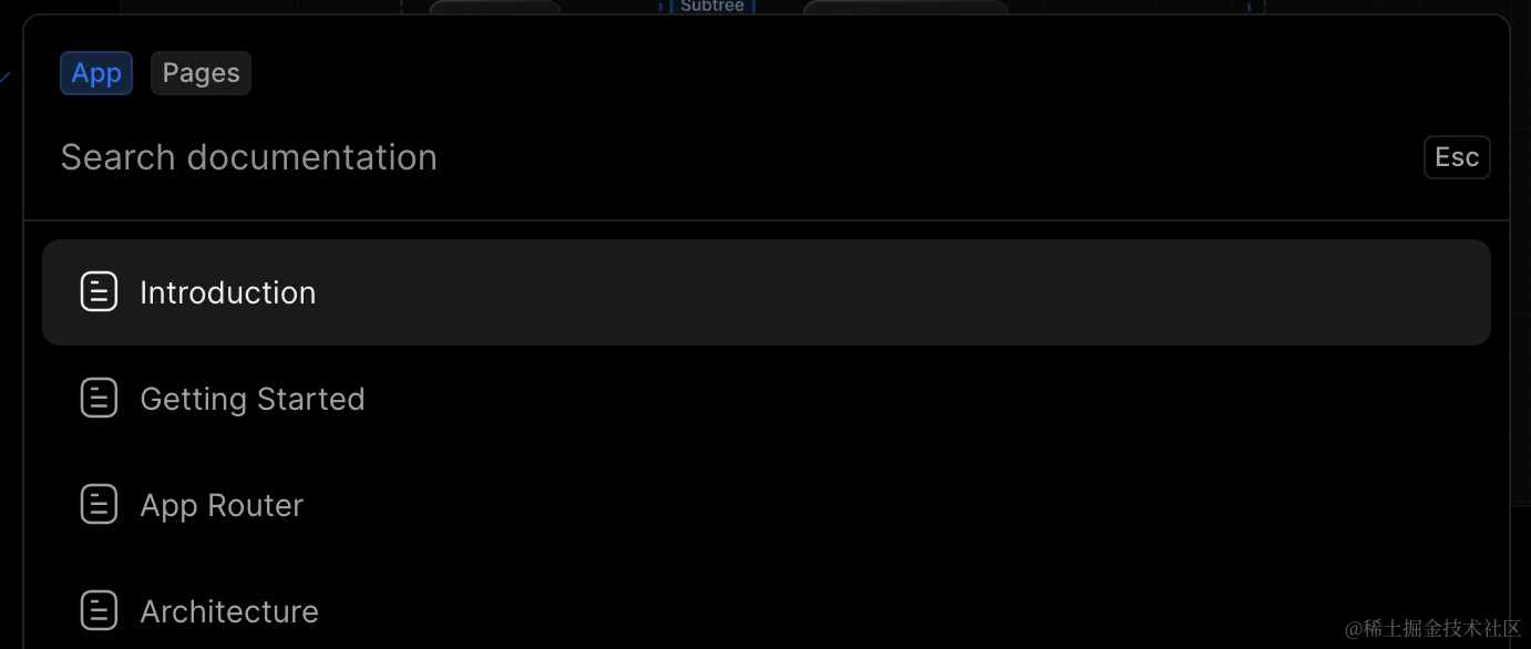你在 Next.js 官方文档进行搜索的时候,左上角会有 App 和 Pages 选项,这对应的就是 App Router 和 Pages Router: