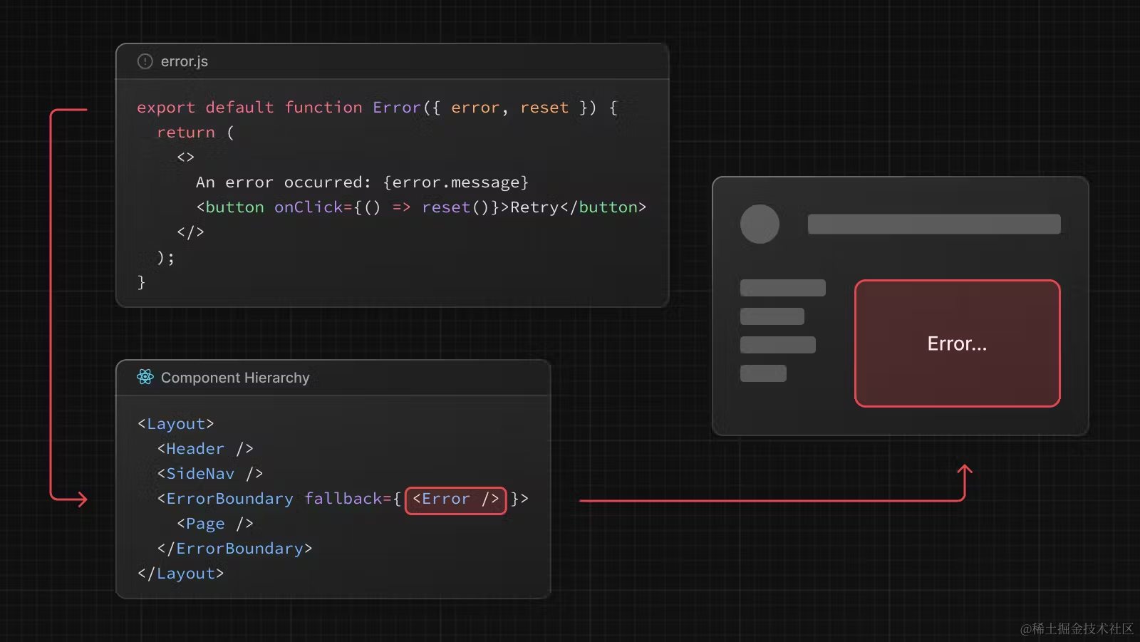 有时错误是暂时的,只需要重试就可以解决问题。所以 Next.js 会在 error.js 导出的组件中,传入 reset 函数,帮助尝试从错误中恢复。该函数会触发重新渲染错误边界里的内容。如果成功,会替换展示重新渲染的内容。