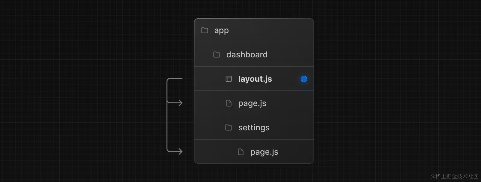 你可以发现:布局是支持嵌套的,app/dashboard/settings/page.js 会使用 app/layout.js 和 app/dashboard/layout.js 两个布局中的内容,不过因为我们没有在 app/layout.js 写入可以展示的内容,所以图中没有体现出来。