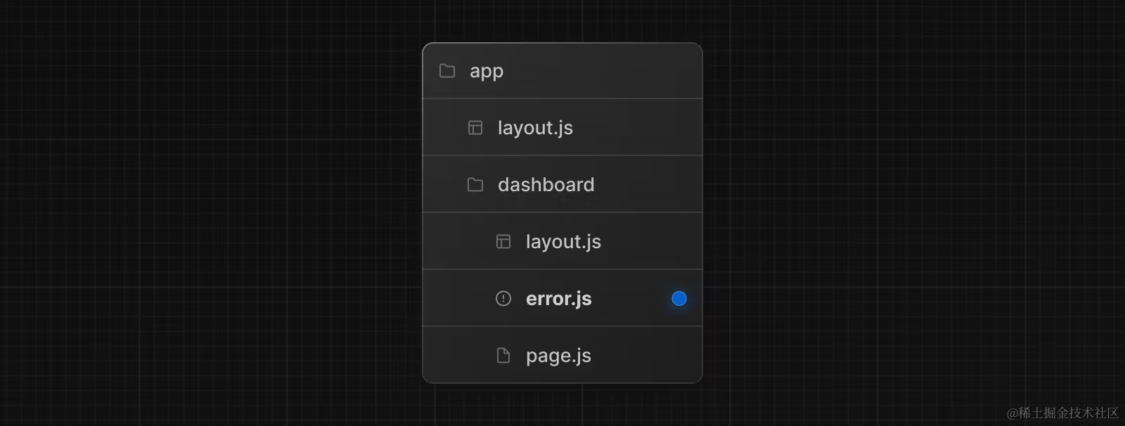 我们写一个 demo 演示一下 error.js 的效果。dashboard 目录下新建一个 error.js,目录效果如下: