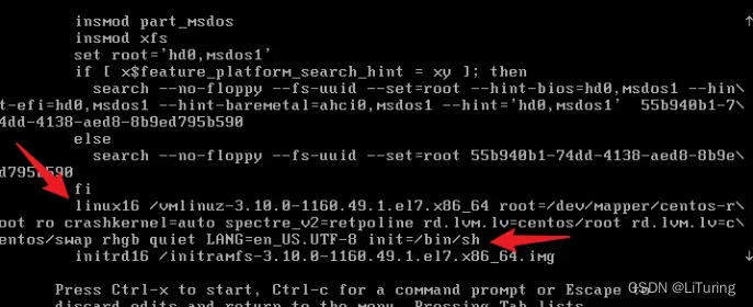 3.不断按键盘↓找到以linux开头的行,然后继续移动光标至该段落的最后,比如这边我应该移动到LANG=zh_CN.UTF-8 后面,在它后面添加一个空格并输入init=/bin/sh