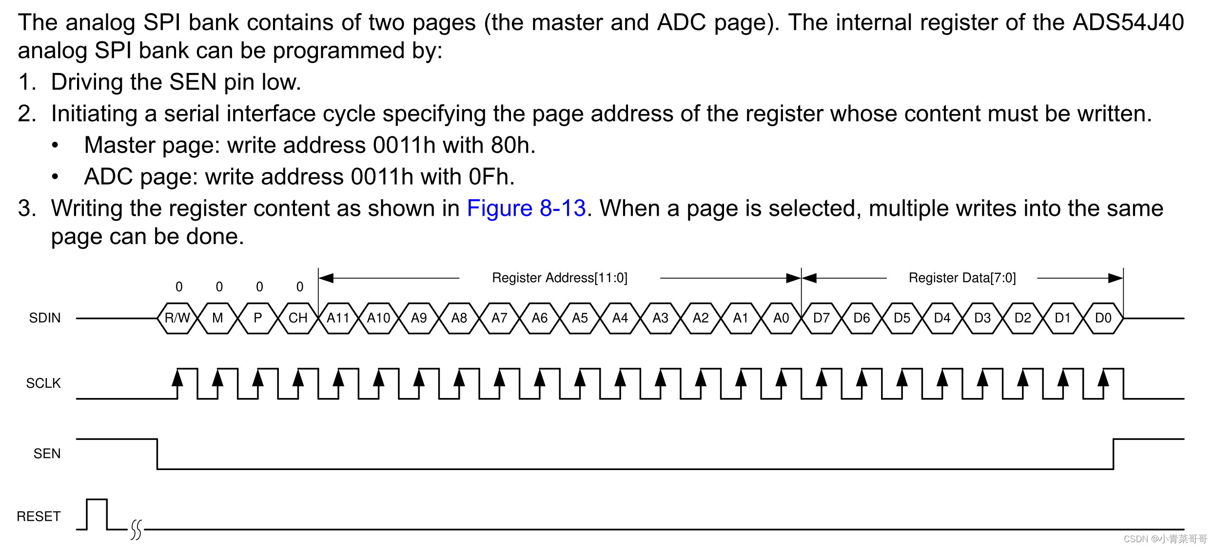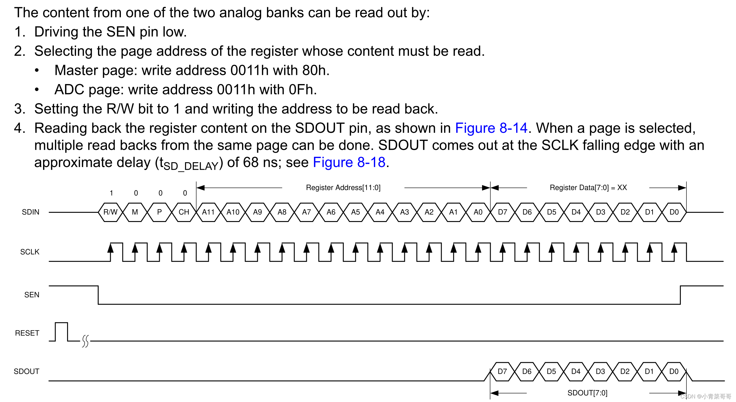 该ADC的配置引脚共包括PDN、RESET、SCLK、SDIN、SDOUT、SEN这6个引脚,我们根据数据手册的描述相应控制即可。切记:SCLK不能超过2MHz。如下图13所示为寄存器空间分布: