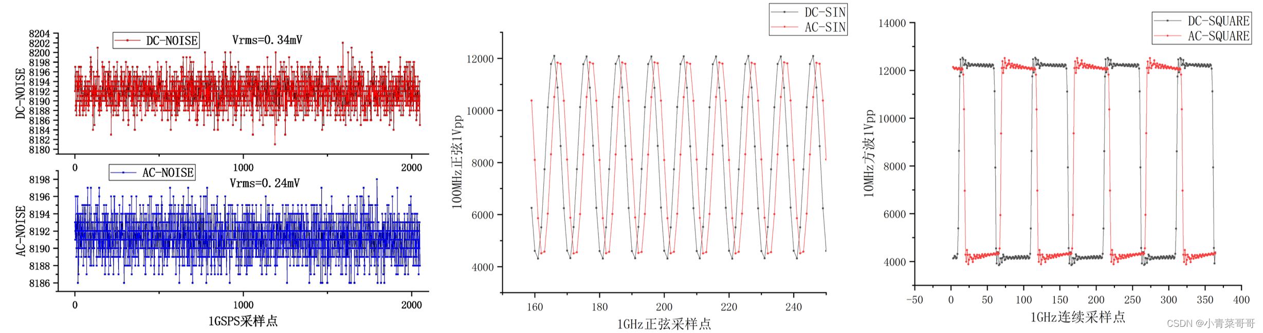 取每lane的32bit数据后,按照ADC手册给出的图2结构,将这32bit拆分就可以得到采样数据了。如下图33所示为FPGA最终得到的1GHz采样率下的噪声、正弦以及方波信号:
