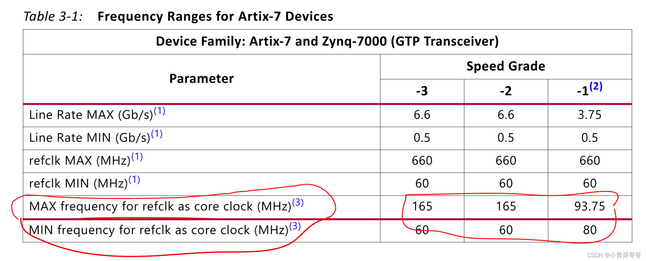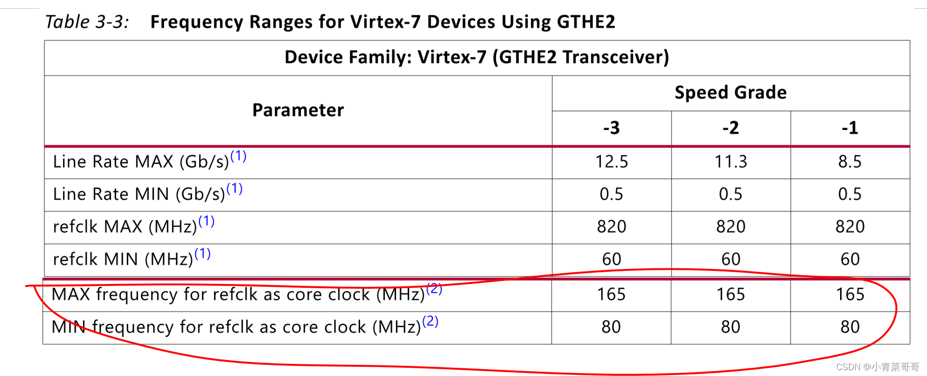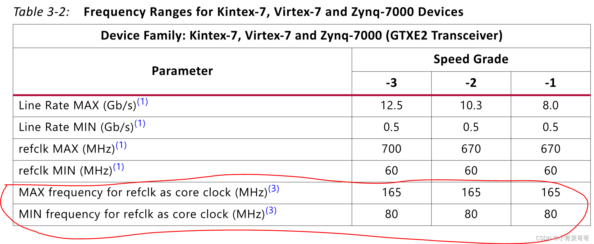 在简便方案中,glbclk被refclk替代了,我们就可以少提供1路时钟给FPGA。但是我们要注意,refclk作为glbclk使用时,IP核规定了不同型号FPGA的refclk频率范围。如下图6、7、8所示: