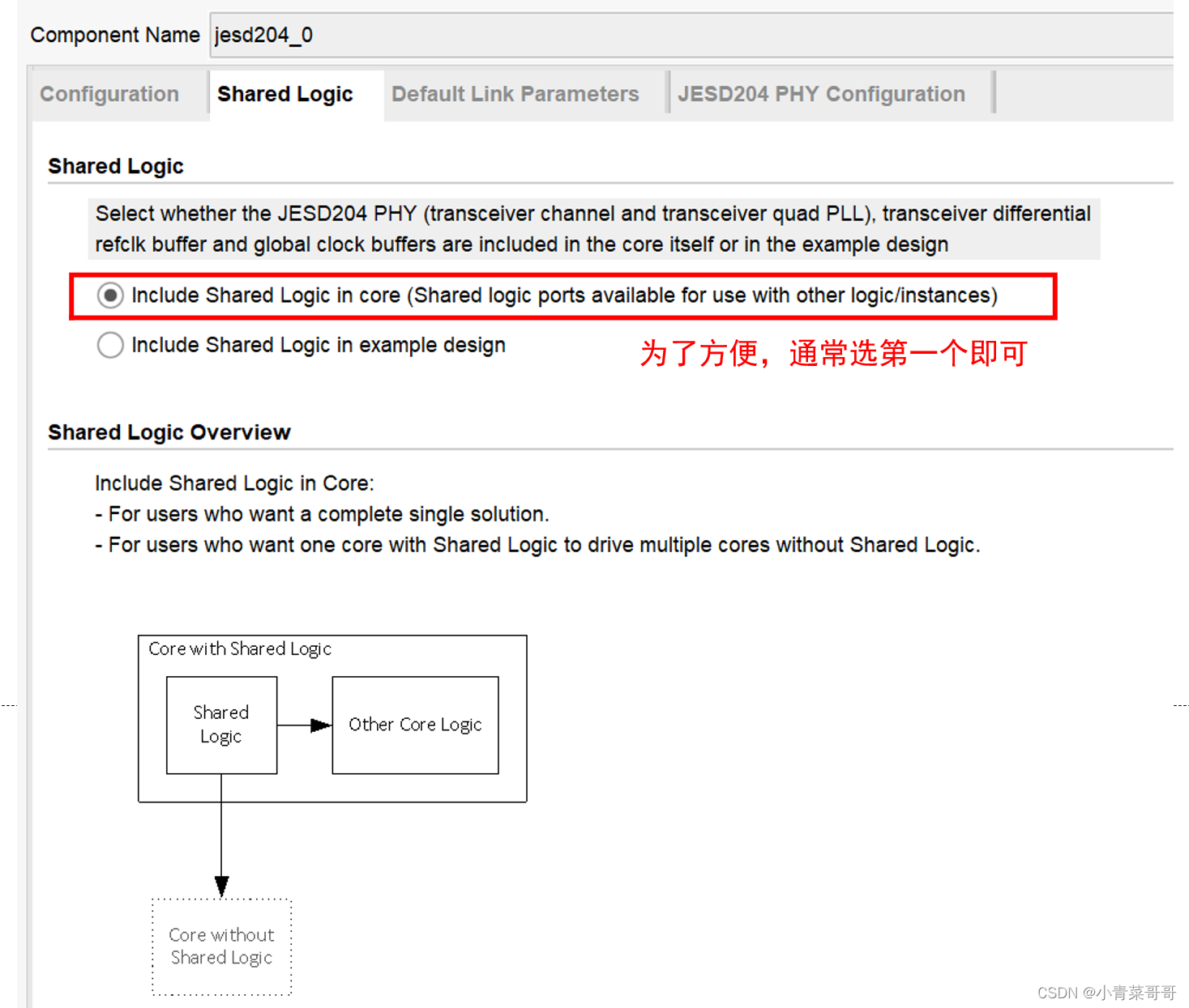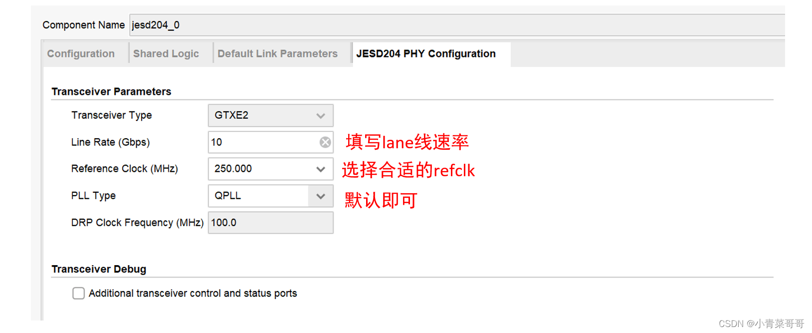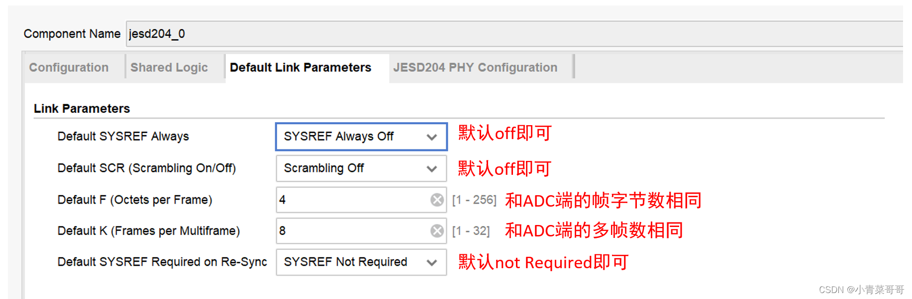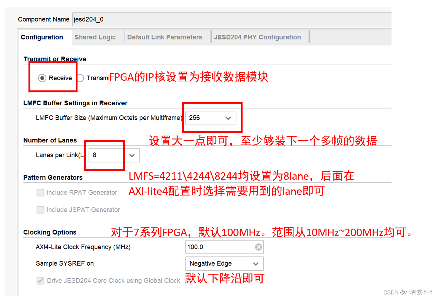 5)理解了以上参数后,我们需要了解FPGA jesd204b IP核的相关内容,对于xilinx 的IP核同样设定LMFS=4211这样的参数后,我们就可以一步步来确定ADC和FPGA的时钟/SYSREF了。