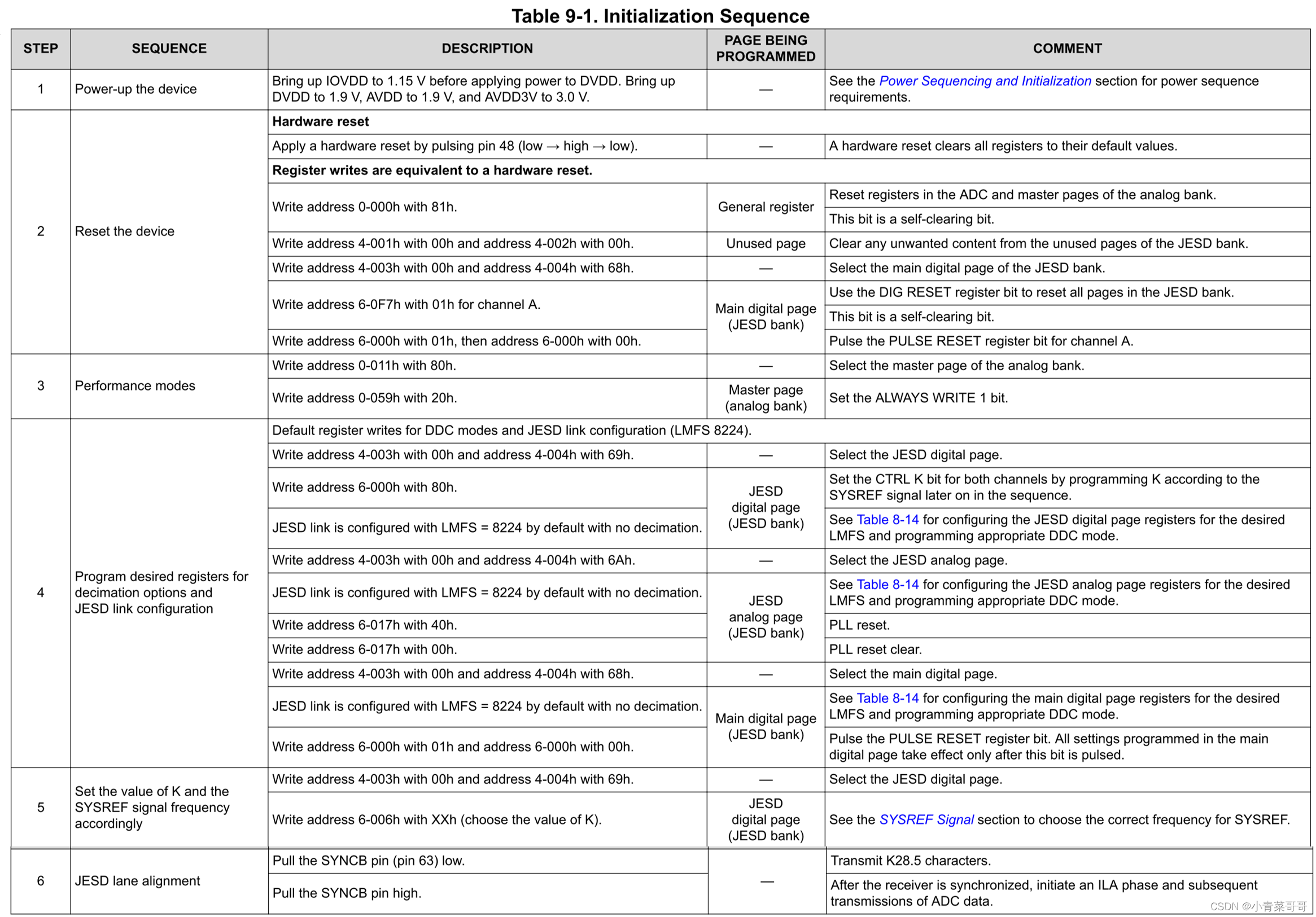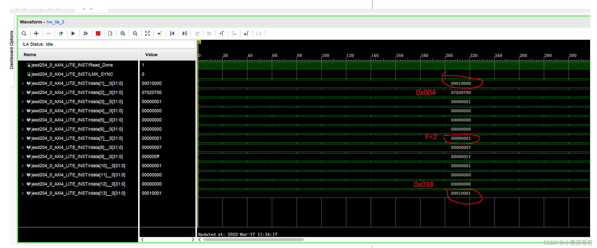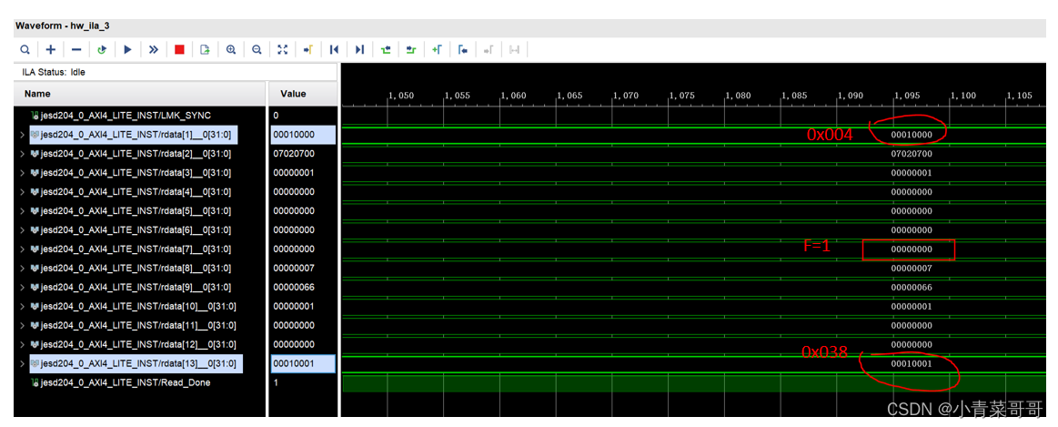 4)复位完成之后,我们需要监视0x038的寄存器值,只有当值为0x0001_0001时,才表明SYSREF和link SYNC正常工作了。