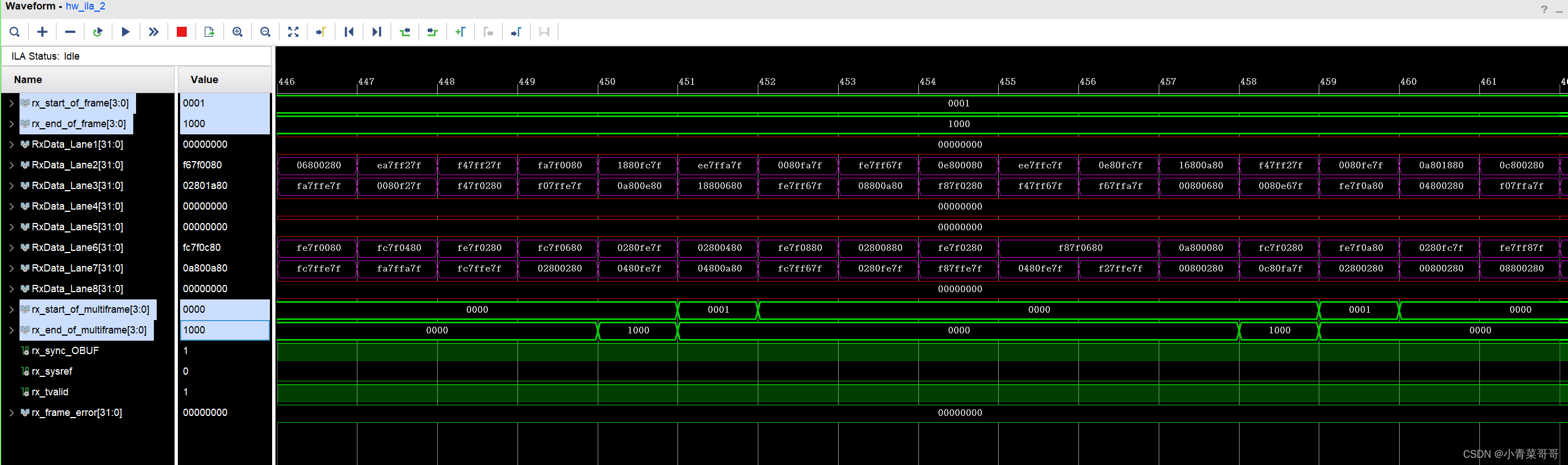 如下图28所示为该模式下的JESD数据输出,我们可以看到:由于IP核例化了8条lane,但实际ADC只占用了4 lanes,所以其余空闲的lane 1、4、5、8数据均为0。由于该模式下ADC每帧数据只有1个字节,所以该字节既是帧头、也是帧尾,对应图28上的rx_start_of_frame和rx_end_of_frame则均为4’b1111。又由于ADC配置时我们设置的多帧K为8,对应图28上的rx_start_of_multiframe则是按照4’b0001-4’b0000的顺序循环,rx_end_of_multiframe则是按照4’b0000-4’b1000的顺序循环。
