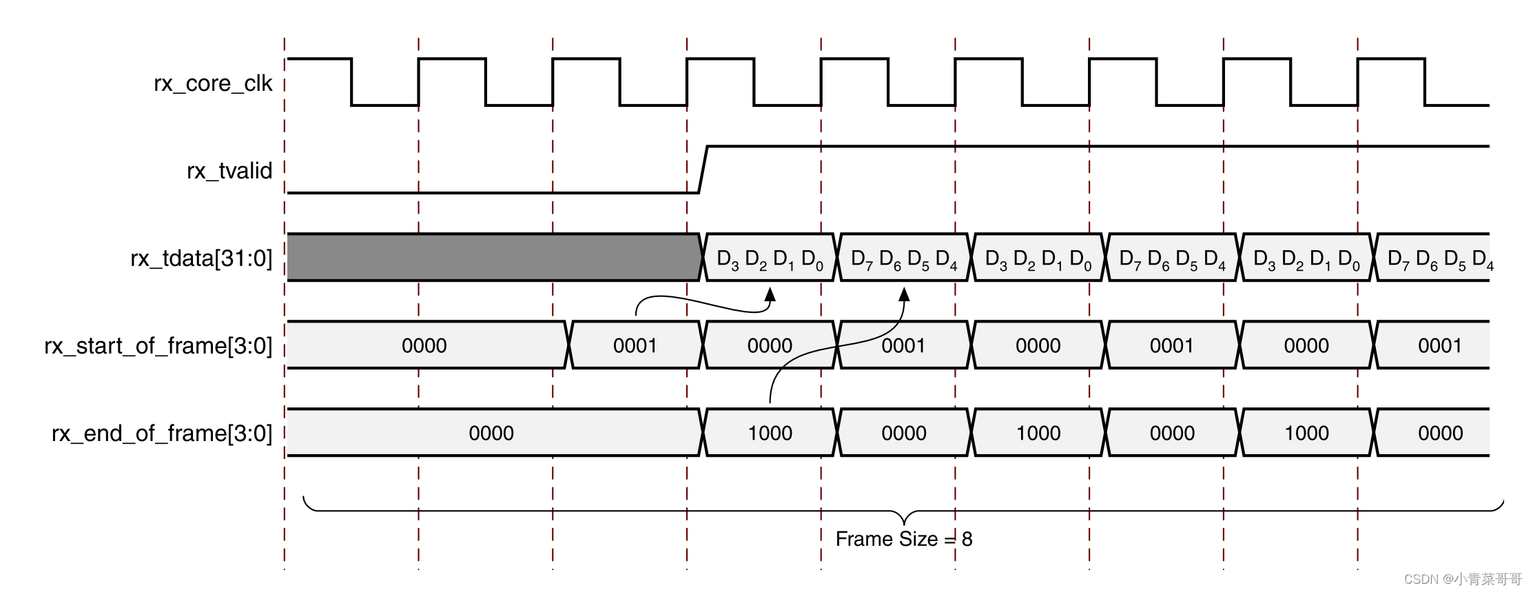 对于每条lane来说,接收到数据都是32bit。如下图26所示为每条lane的数据和帧之间的对应关系(以F=8举例),其中包括帧起始和帧结尾的标志位,方便我们识别ADC数据。F=8意味着一帧数据包含8个字节(D7~D0),而每lane的rx_data在每个周期都输出32bit,共4个字节,因此一帧字节需要两个时钟周期输出,这时候就通过rx_start_of_frame和rx_end_of_frame来识别这一帧数据的帧头和帧尾,有的时候我们还需要rx_start_of_multiframe和rx_end_of_multiframe信号来识别多帧的头尾。