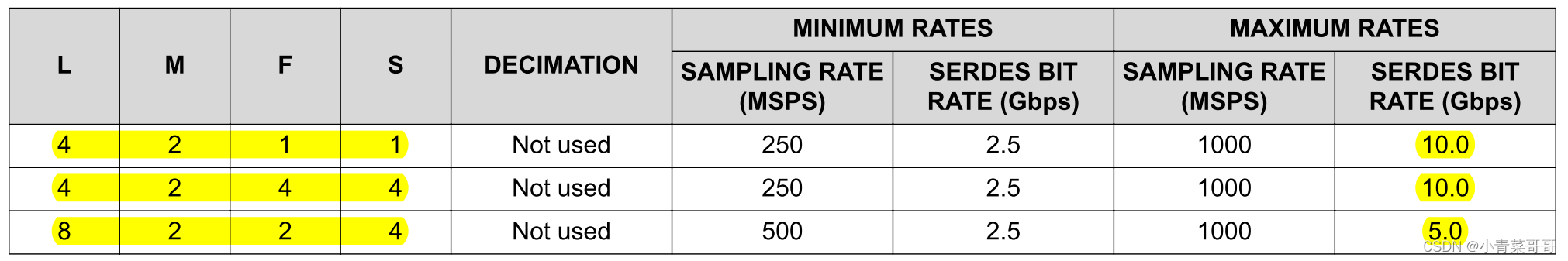 开发这款ADC时,我们首先要确定ADC工作的参数,这样才能把时钟配置的参数定下来。ADC的数据手册给出了3种jesd的链路参数,分别为LMFS=4211、4244以及8224,如下图1所示: