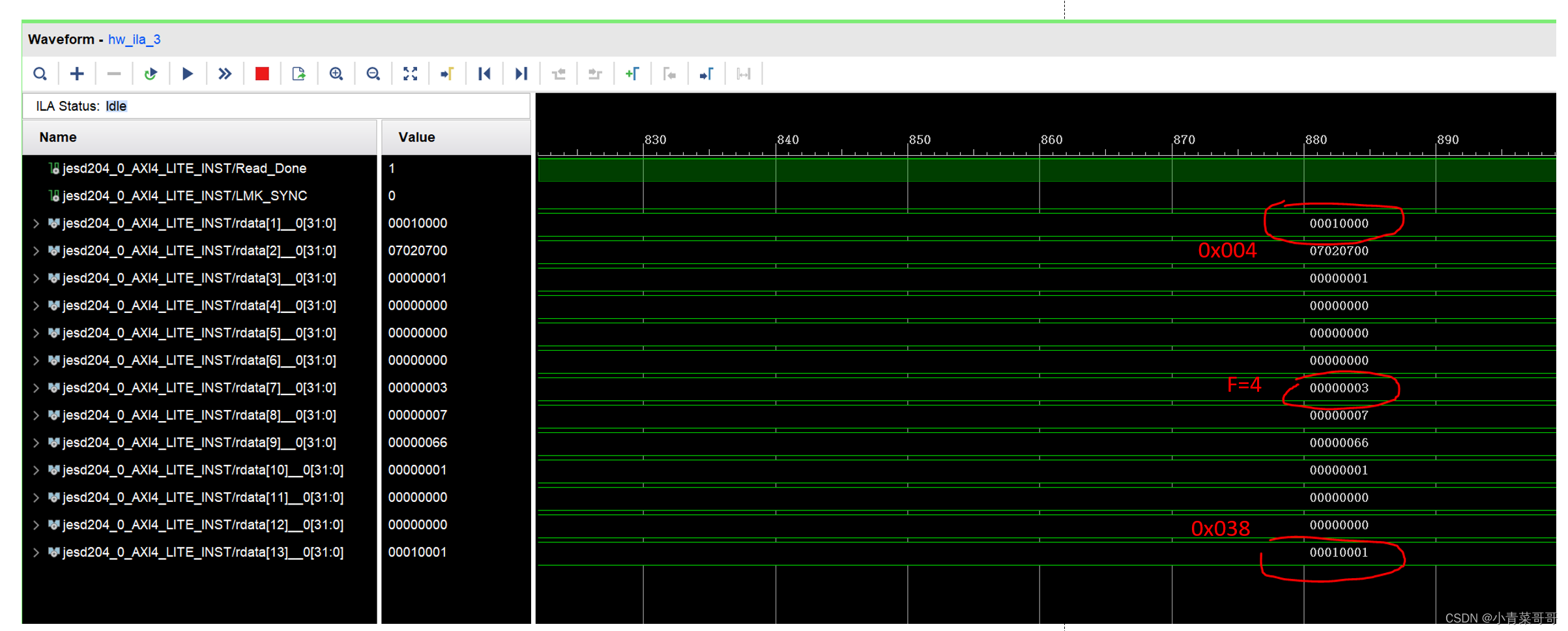 注意LMFS=8224时使用了8 lanes,并且DA2与DA3、DB2与DB3的数据顺序是交换的,这里需要注意一下。AXI配置的寄存器数据读取如下图31所示,JESD数据输出如下图32所示: