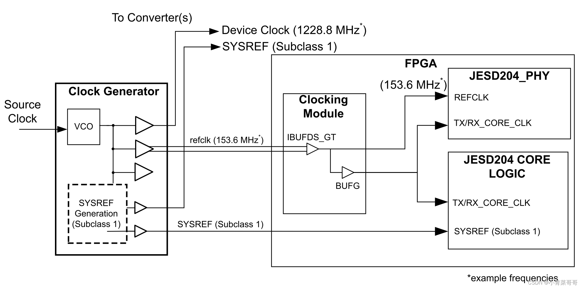 5)理解了以上参数后,我们需要了解FPGA jesd204b IP核的相关内容,对于xilinx 的IP核同样设定LMFS=8224这样的参数后,我们就可以一步步来确定ADC和FPGA的时钟/SYSREF了。