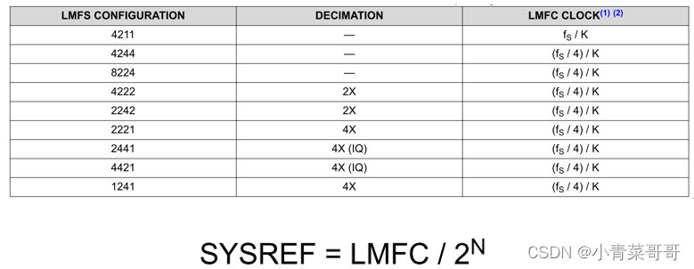 6)根据图1给出的数据,在采样率为1GSPS时,每条lane的线速率为10Gbps。假定我们需要实现的是1GSPS的采样,很自然的LMK04832需要给ADC提供1GHz的时钟输入,另外对于实现subcalss 1来说,ADC的SYSREF是多少呢?ADC手册已给出,如图3所示。这里我们把K设成8,2N=8,这样SYSREF=3.90625MHz。这样LMK04832就给ADC提供CLK=1GHz,SYSREF=3.90625MHz的差分时钟即可。