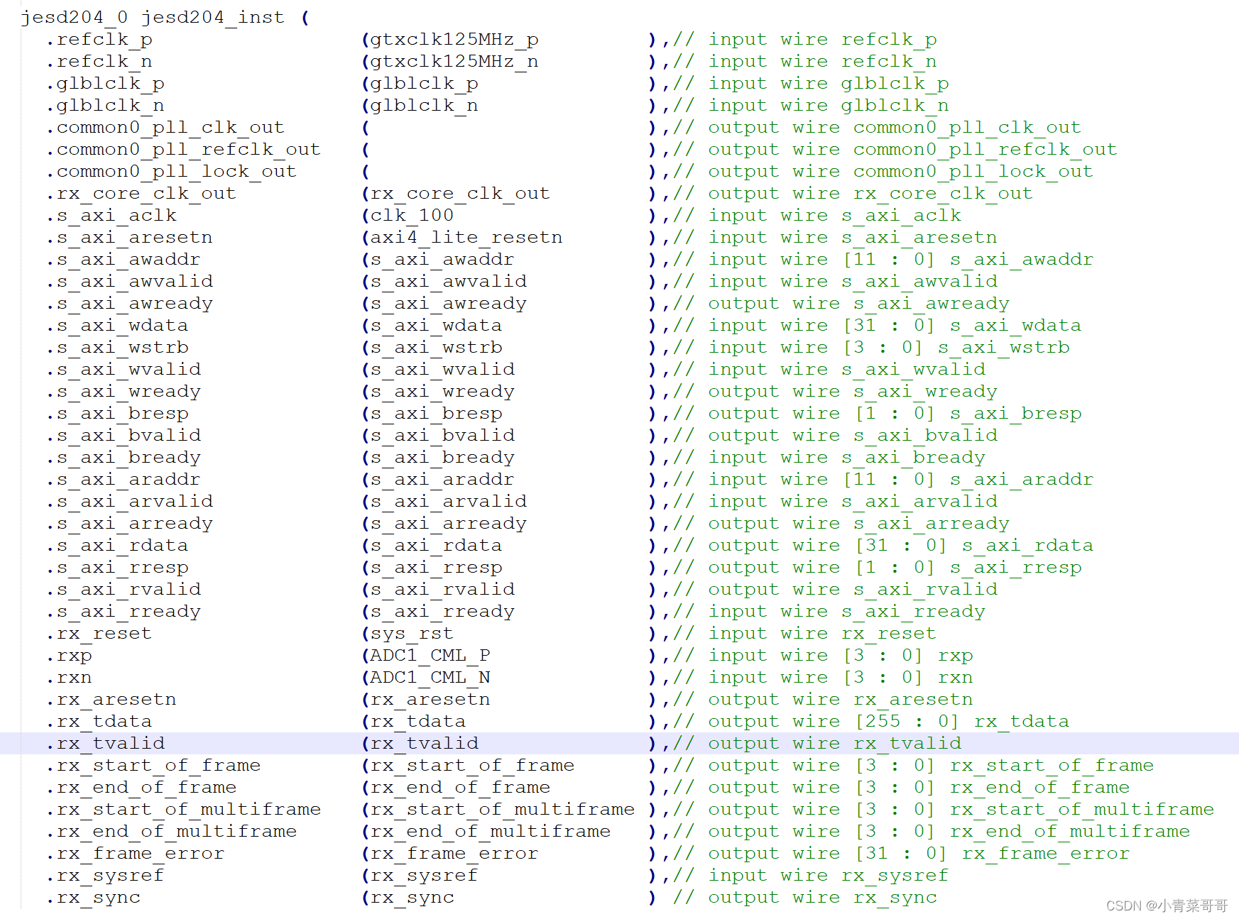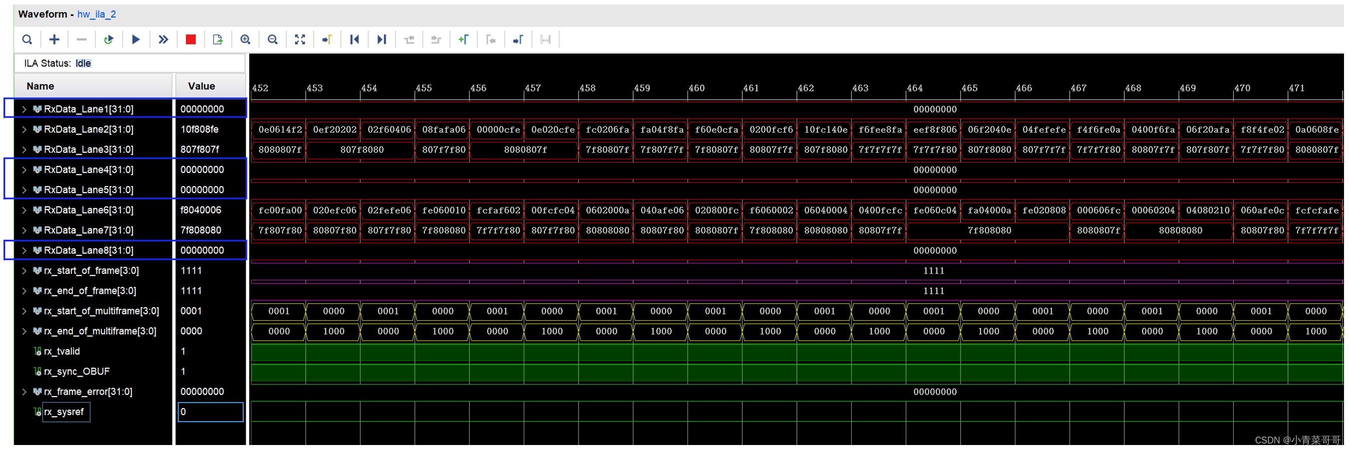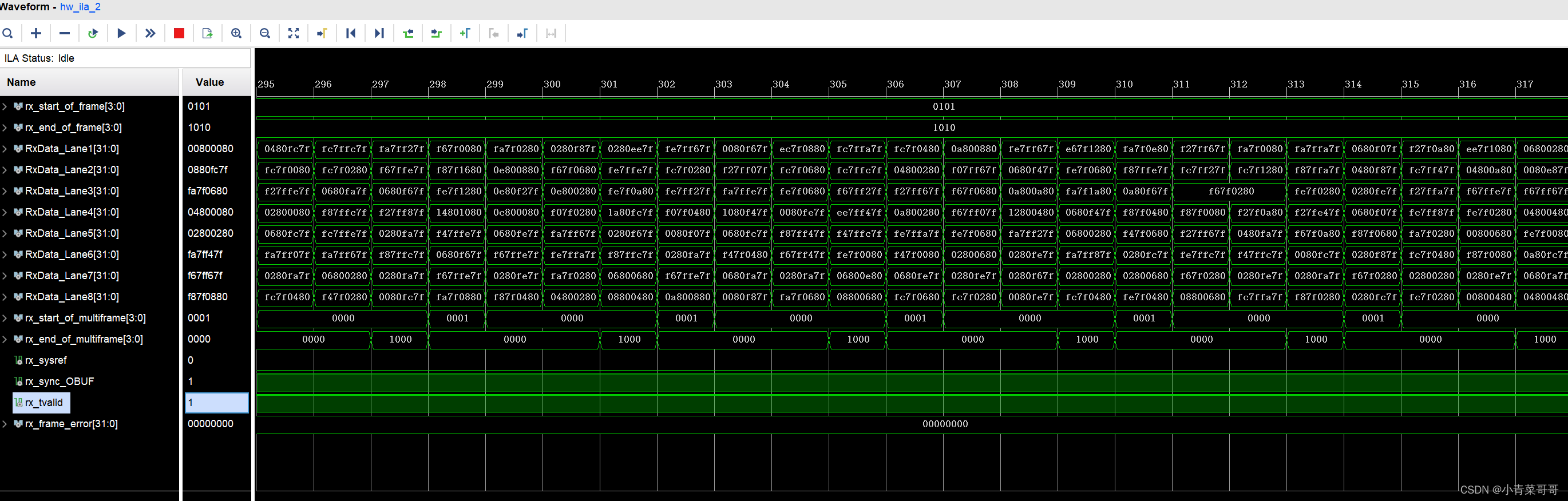 对于这款ADC来说,JESD IP核例化时我们选择的是8 lanes,因此得到的数据位宽为[255 : 0]。
