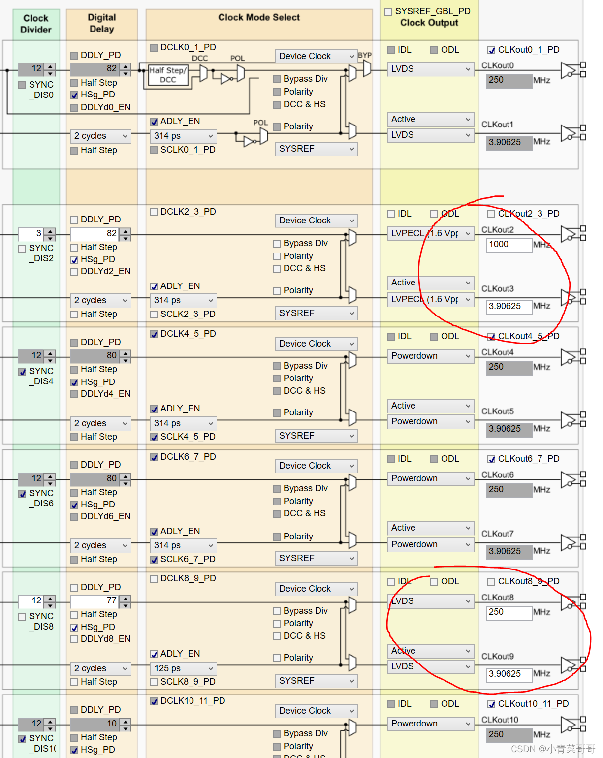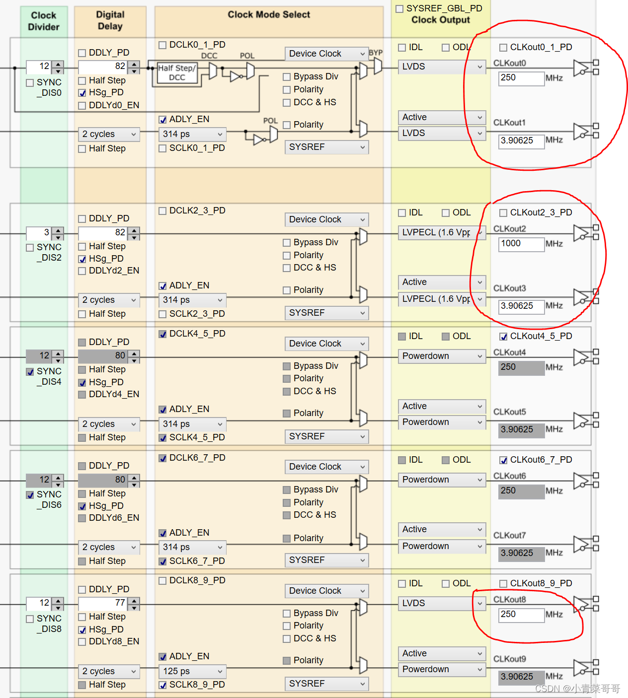 我们把LMK04832的DCLKOUT2作为ADC_CLK、把SDCLKOUT3作为ADC_SYSREF、把DCLKOUT8作为FPGA_refclk,把SDCLKOUT9作为FPGA_SYSREF,其它时钟不输出即可。设置如下图11所示: