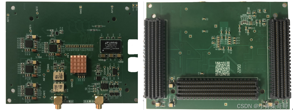如下图为小青菜哥哥设计的基于该款ADC的功能子板,2路待测模拟信号均通过SMA接口引入,其中1路经过变压器交流差分耦合后进入ADC采样,另一路经过直流差分放大器芯片后进入ADC采样,并在该ADC上安装了散热片。