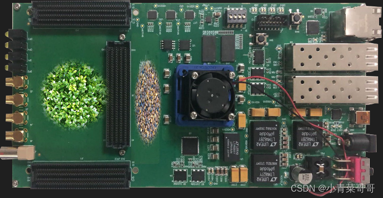 如下图为小青菜哥哥设计的基于xilinx kintex7系列FPGA的母板,该母板的FPGA数据输出接口包括1路千兆以太网口、2路SFP光纤口以及1路USB串口。信号进出FPGA的方式为1个FMC HPC接插件、2个FMC LPC接插件,其中包括了LVDS、GTX、时钟、3.3V/2.5V/1.8V单端信号IO等,并板载了8Gb DDR3存储器和LMK048**系列的高精度可编程JESD204B时钟模块。小青菜哥哥设计该母板的初衷就是为了方便进行各种不同的应用开发,在本篇中该母板用在了JESD204B ADC应用开发。