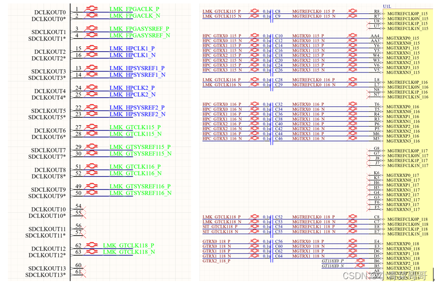 在了解了LMFS=4211、4244以及8224分别对应的时钟方案后,接下来我们来进行LMK048**的寄存器配置,来实现各个模式的时钟输出。LMK048**的输出端口和FPGA的GT模块端口管脚分布如下图9所示: