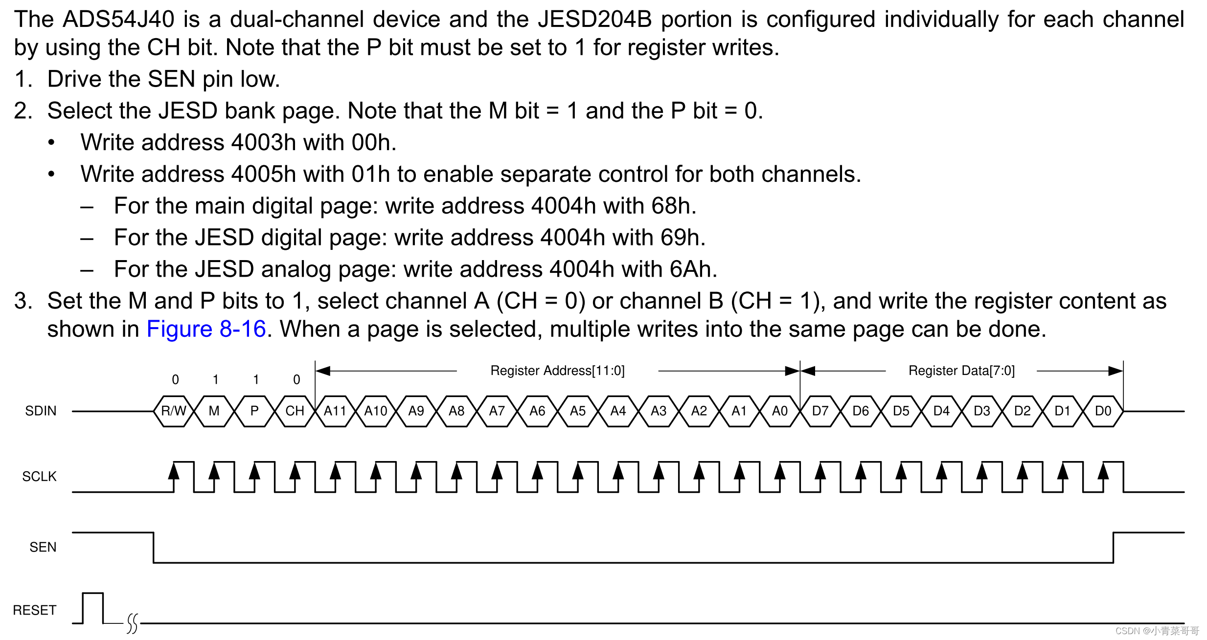 3)JESD Bank写操作如下图16所示,注意:如果不对4005h操作,则通道A和B配置相同的内容,读操作同样如此: