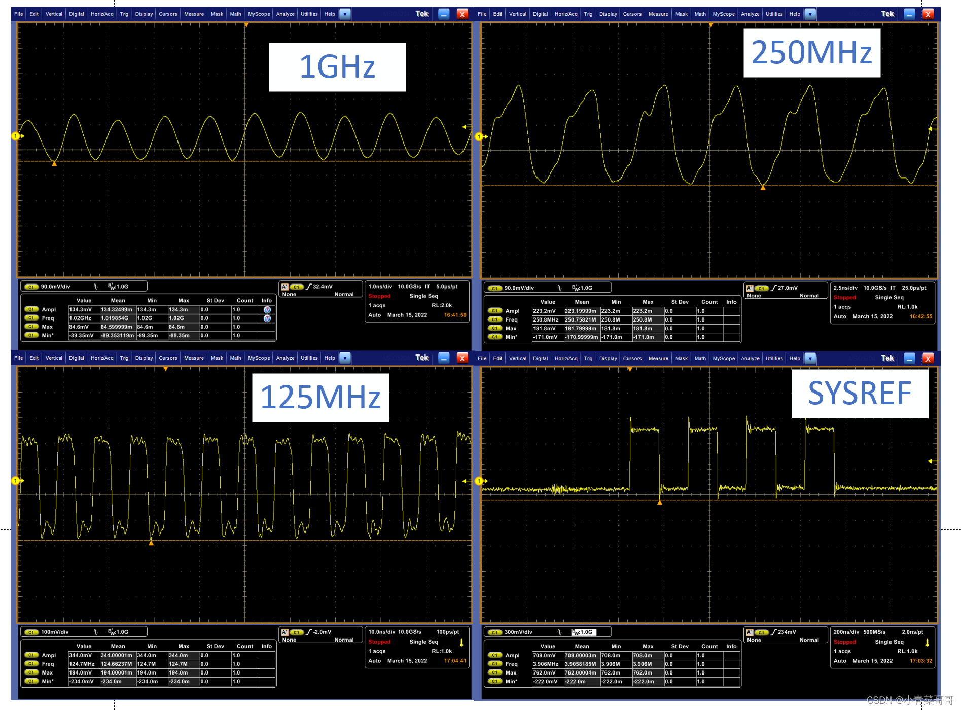 配置设置好之后,将寄存器值写入LMK04832,即可得到正确的时钟,如下图所示12为不同模式下得到的1GHz、250MHz、125MHz以及3.90625MHz时钟。(注意:为了降低功耗和串扰,本设计将SYSREF设置为只有4个周期的脉冲信号,而不是连续的3.90625MHz时钟)