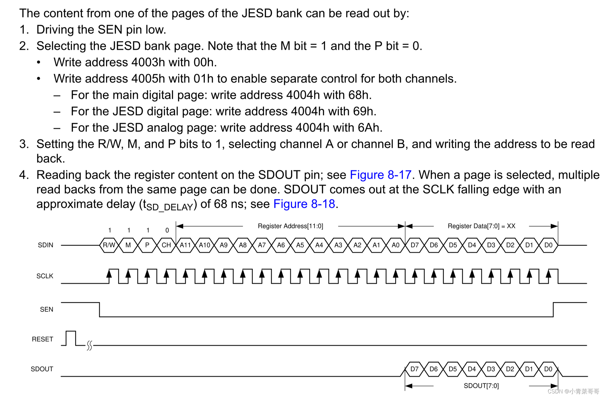 1)L=8指的是8 lanes模式,并且每条lane的最高线速率为5Gbps,结合图2我们可以看到,A通道的采样数据选择管脚DA0~ DA3这4条lane进行数据输出,B通道的采样数据选择管脚DB0~ DB3这4条lane进行数据输出,没有数据线空闲。