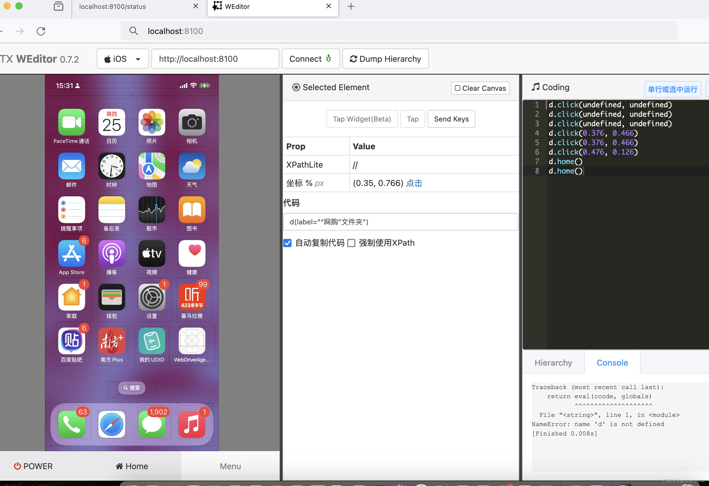 WDA的基础原理是通过webDriverAgentRunner在手机上启动监听,通过电脑iproxy监听端口8100,通过对接XCTest的框架和uiAutomator的框架获取页面的元素和坐标信息,然后相互传递指令和响应完成相关操作。一个简单的应用测试案例如下: